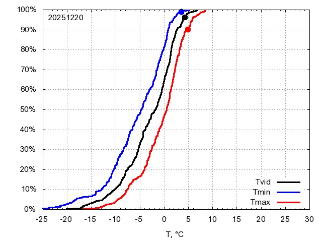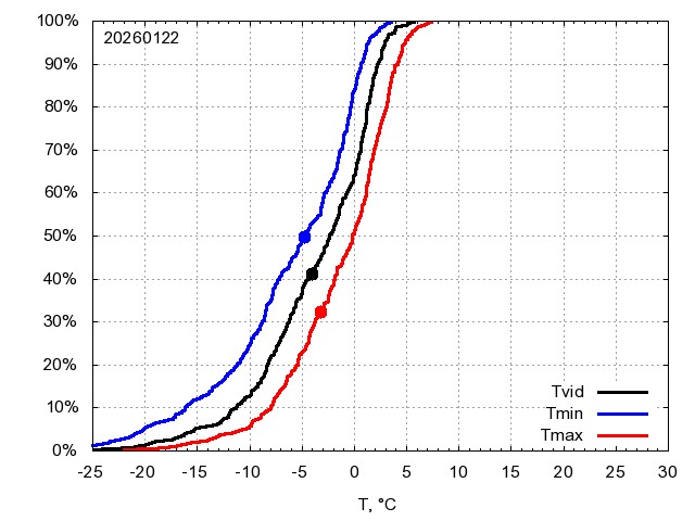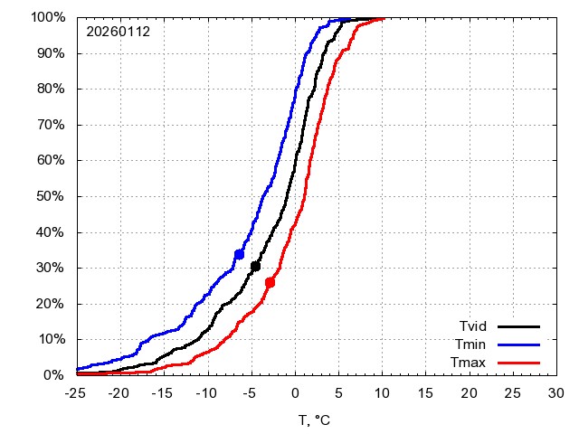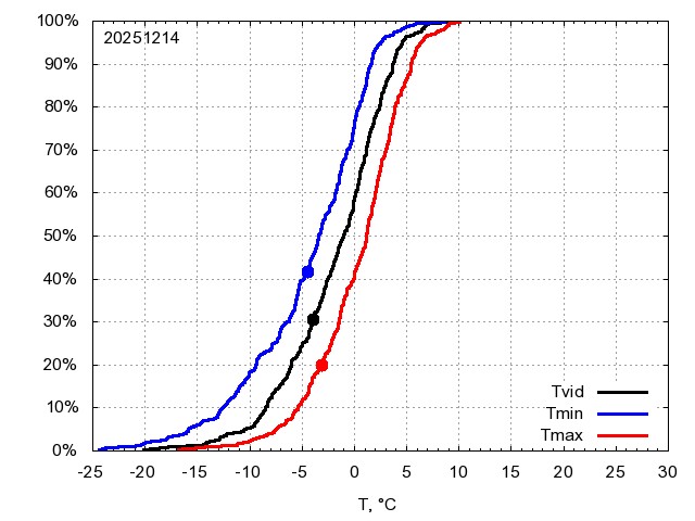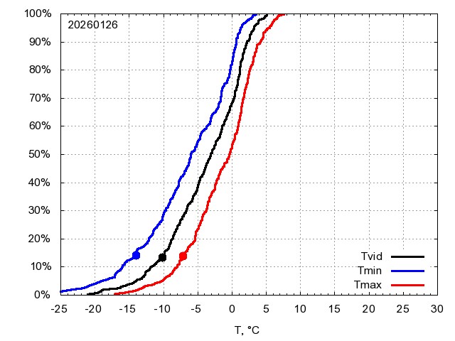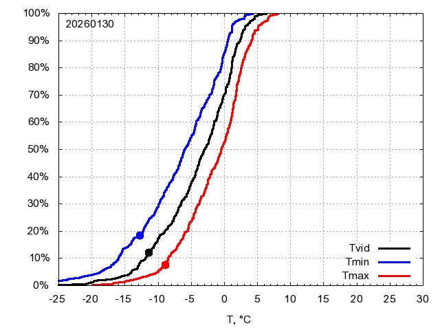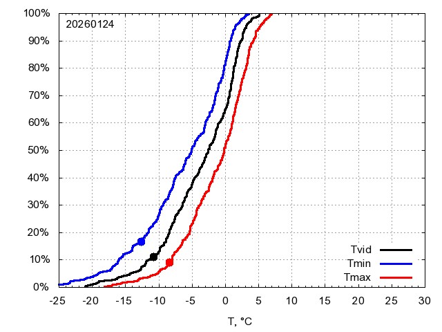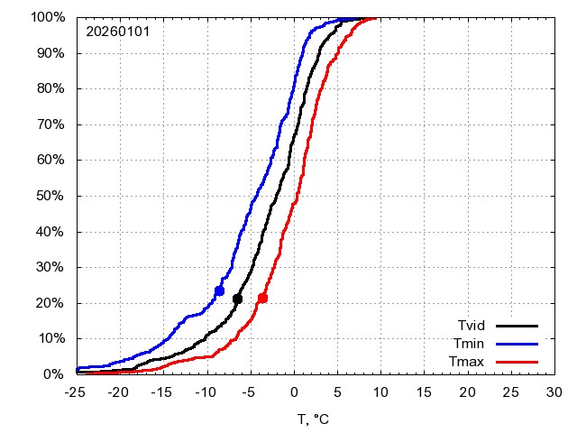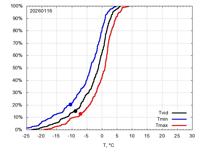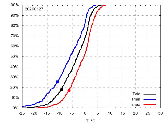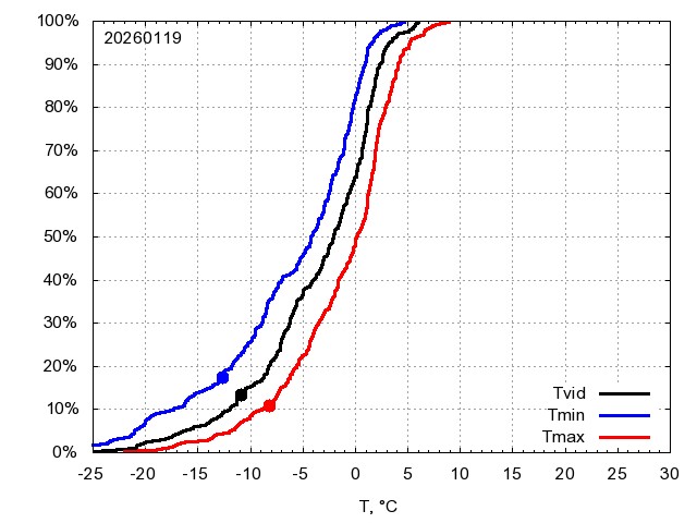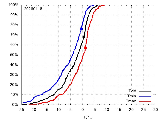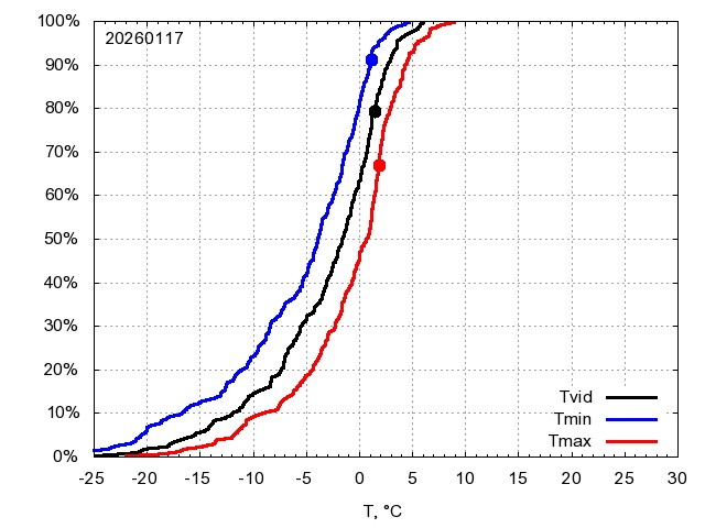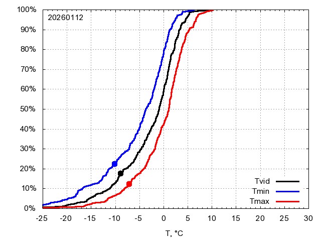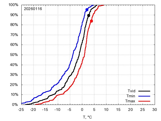 Katra datuma temperatūras novērtējums veikts, salīdzinot diennakts vidējo, minimālo un maksimālo temperatūru Rīgā ar temperatūrām laika posmam 1961-2012, dotajam datumam un 3 datumiem uz priekšu un atpakaļ. Novērtējums izteikts pārsniegšanas varbūtības procentos, kuri tālāk klasificēti atbilstoši zemāk norādītajai leģendai. Tabula satur 15 dienas pagātnē, kā arī 16 dienu prognozi.