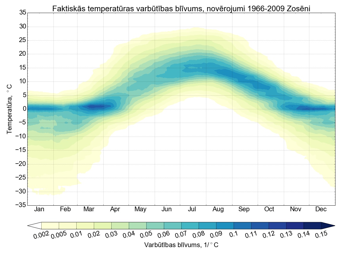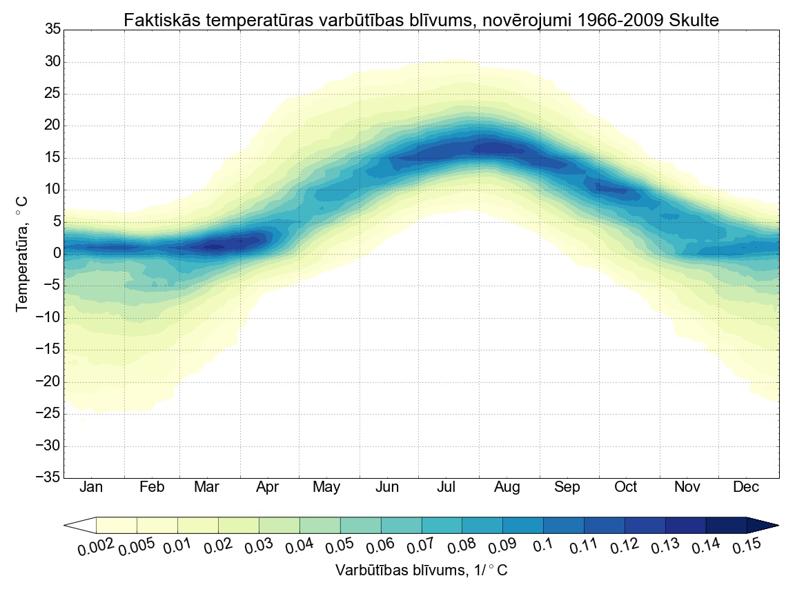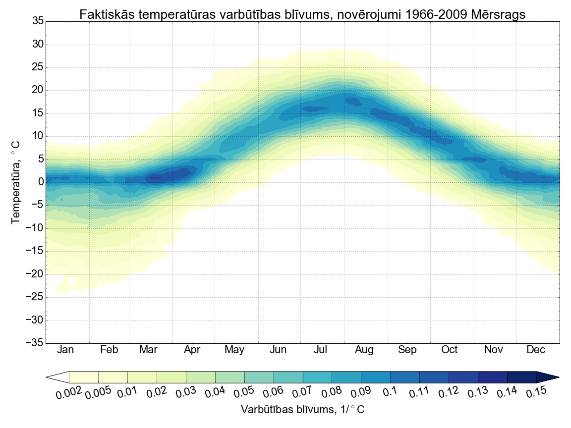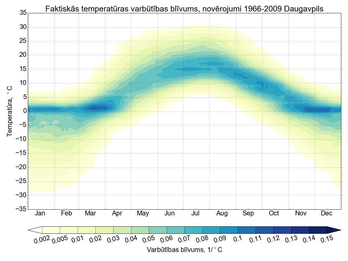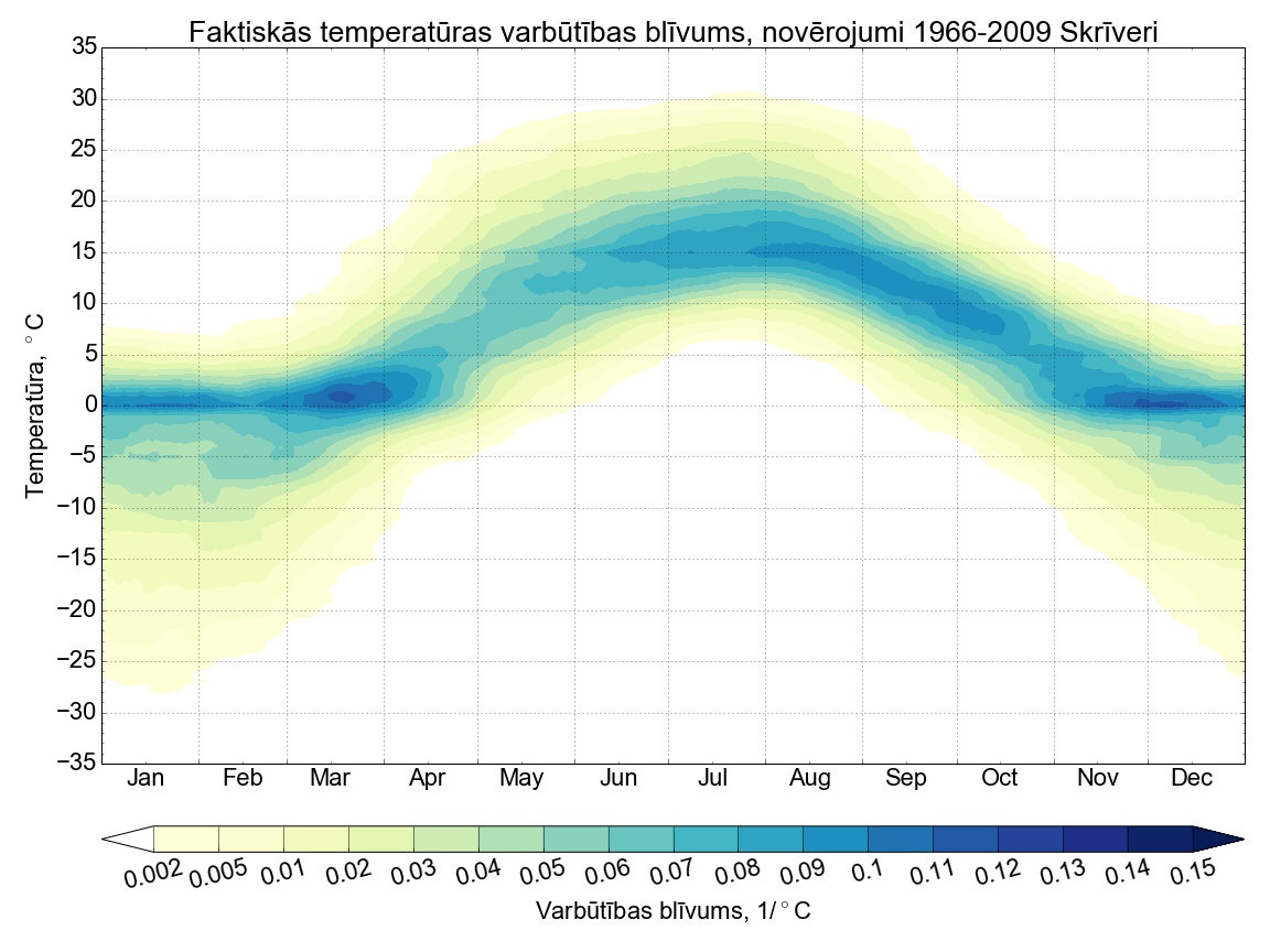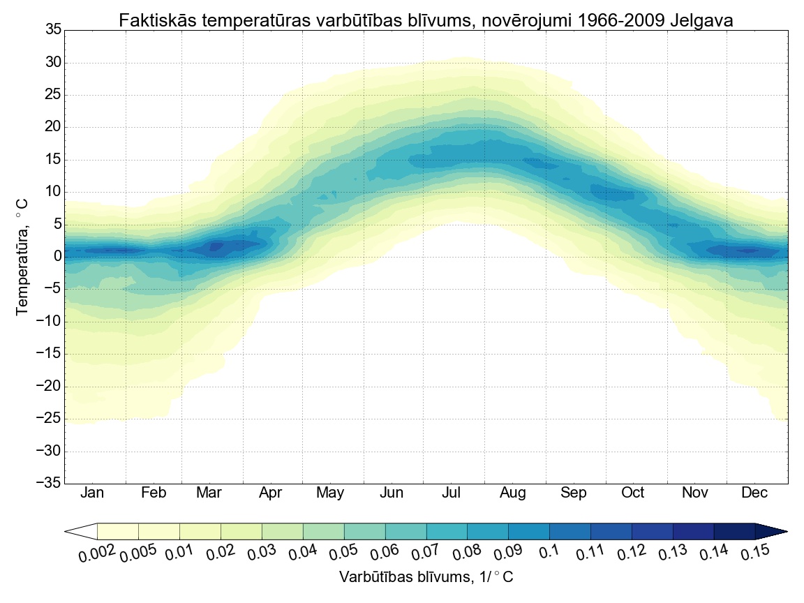 Faktiskās temperatūras pietiekamības līknes un varbūtības blīvums