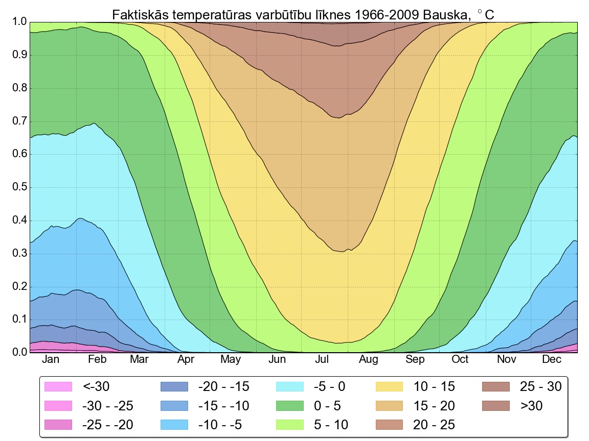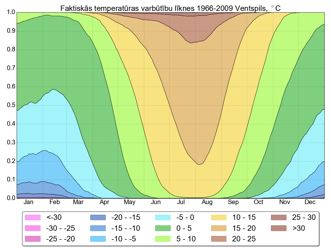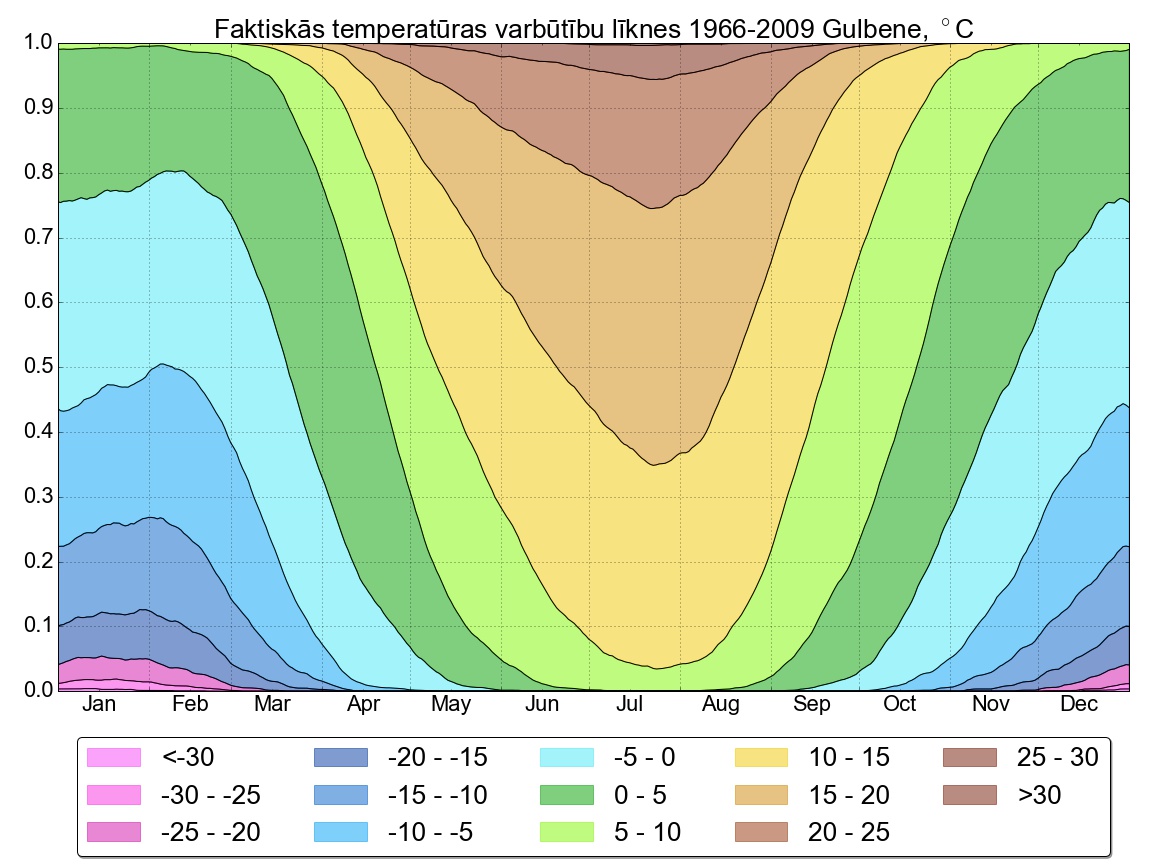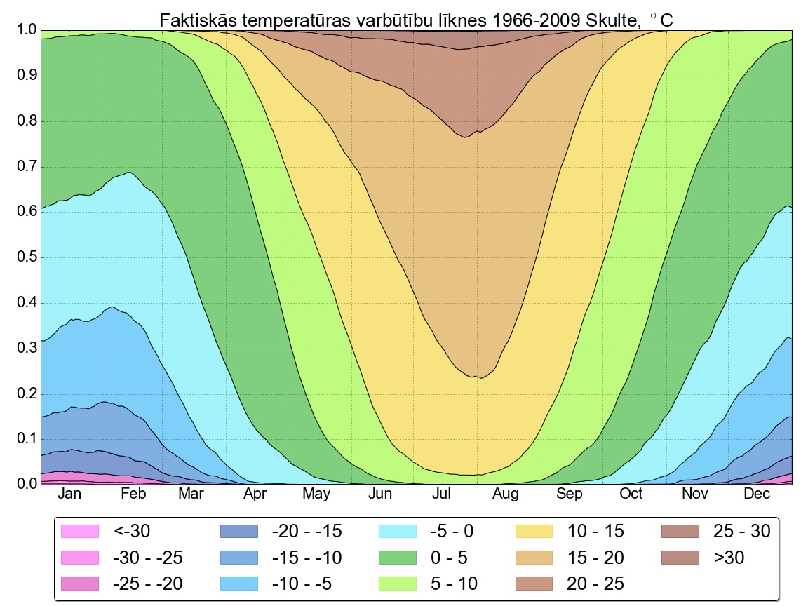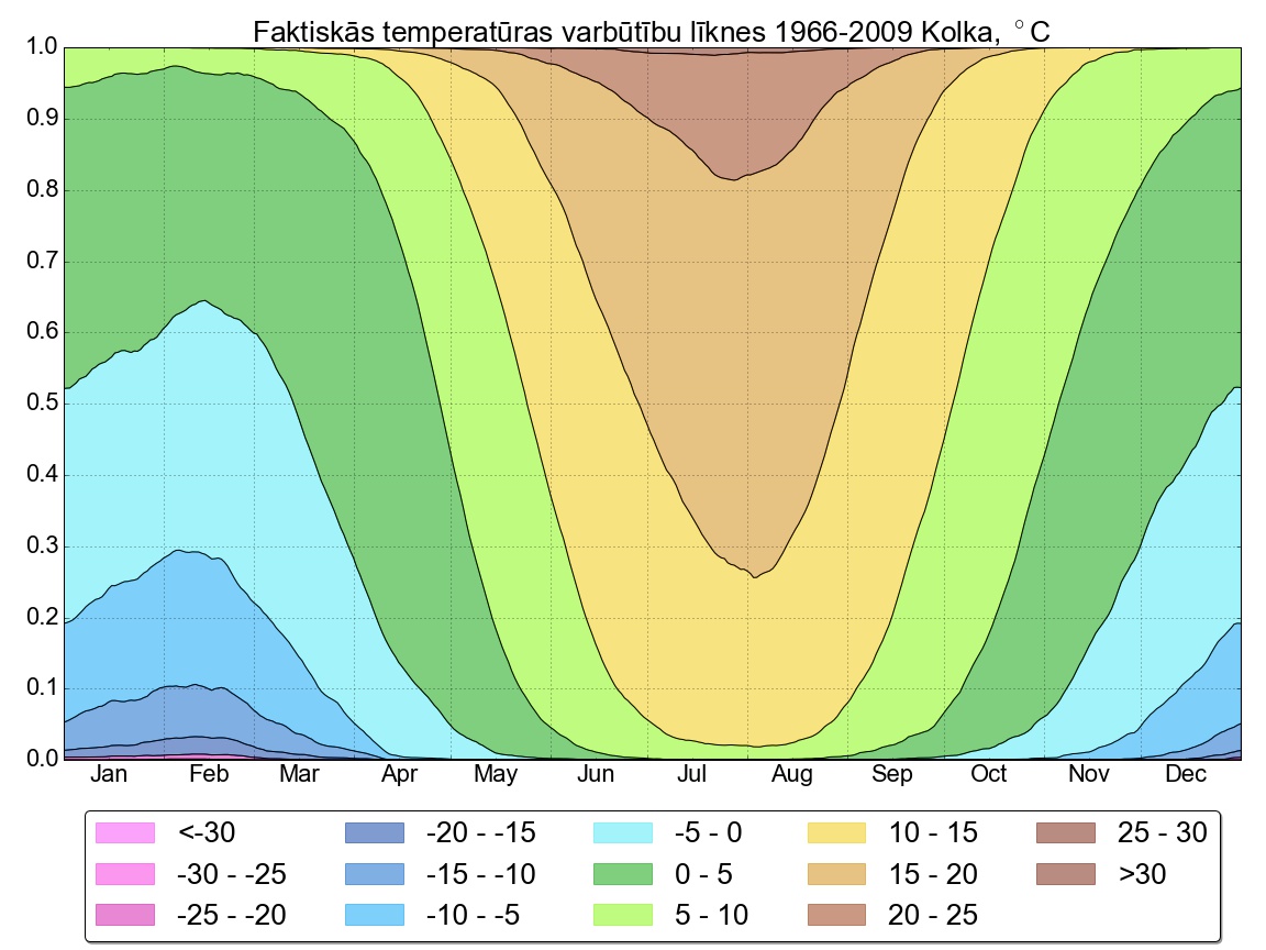 Faktiskās temperatūras pietiekamības līknes un varbūtības blīvums