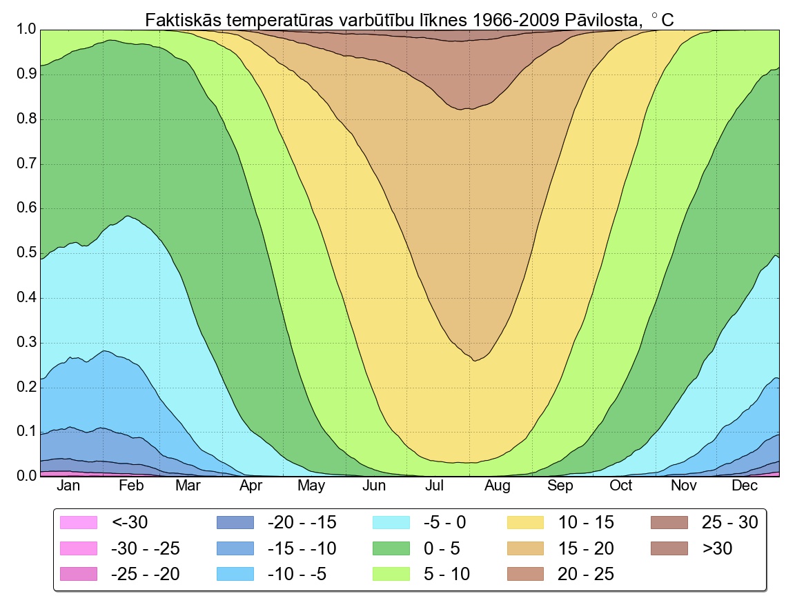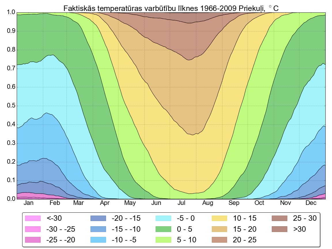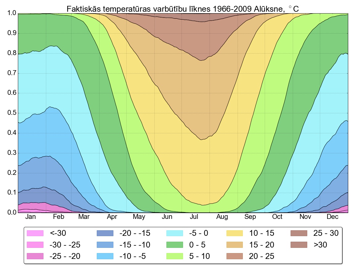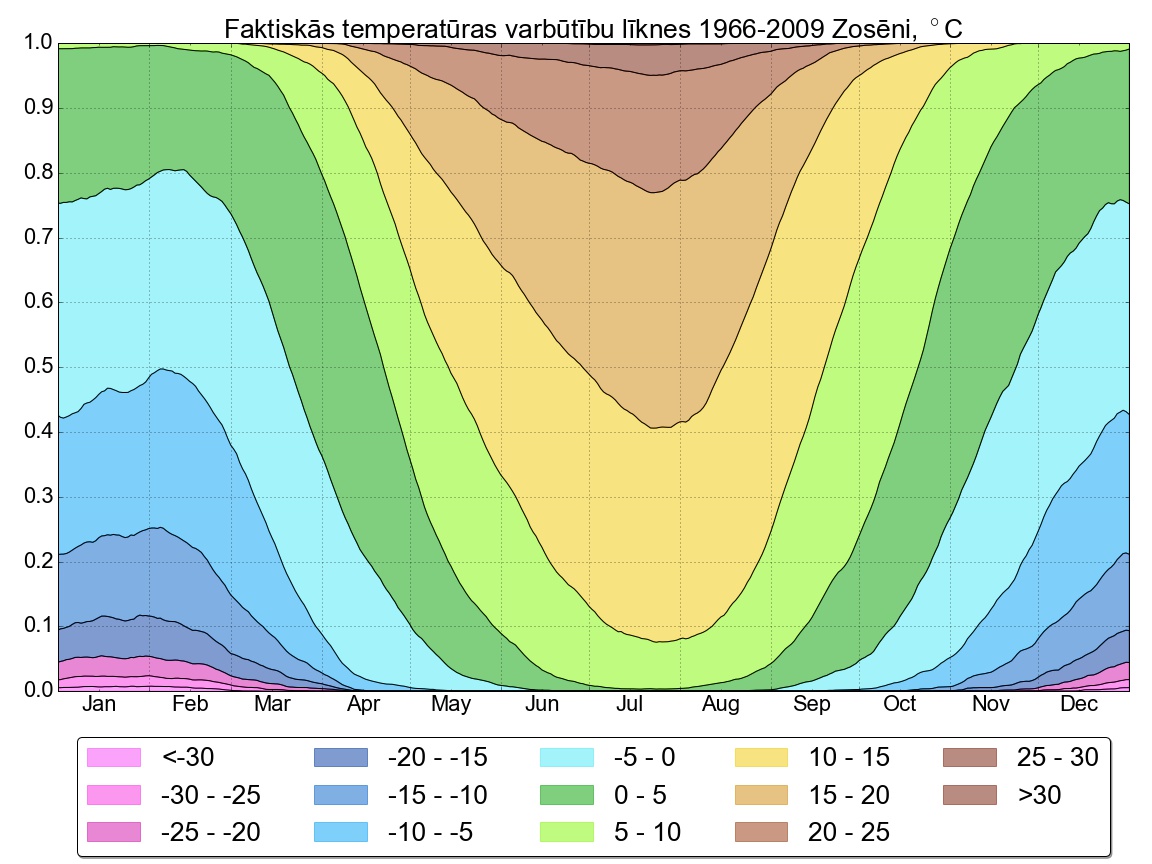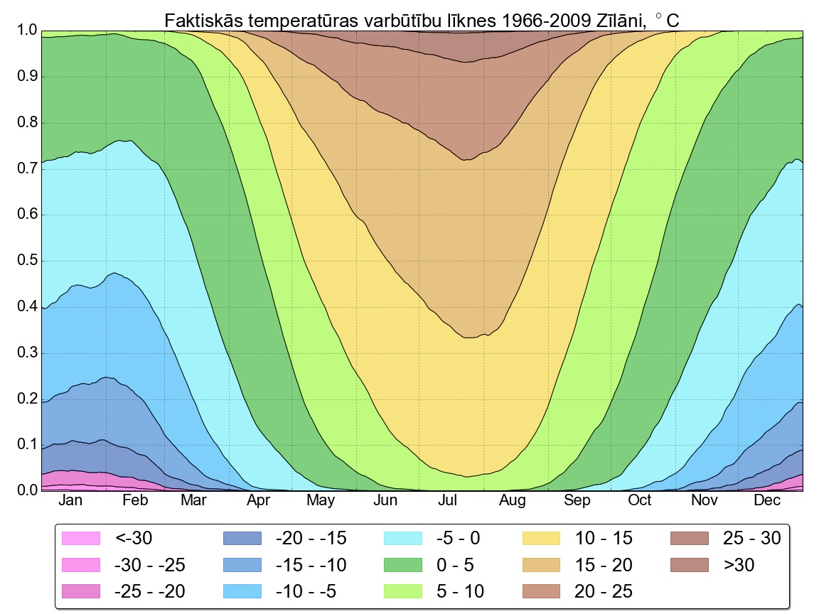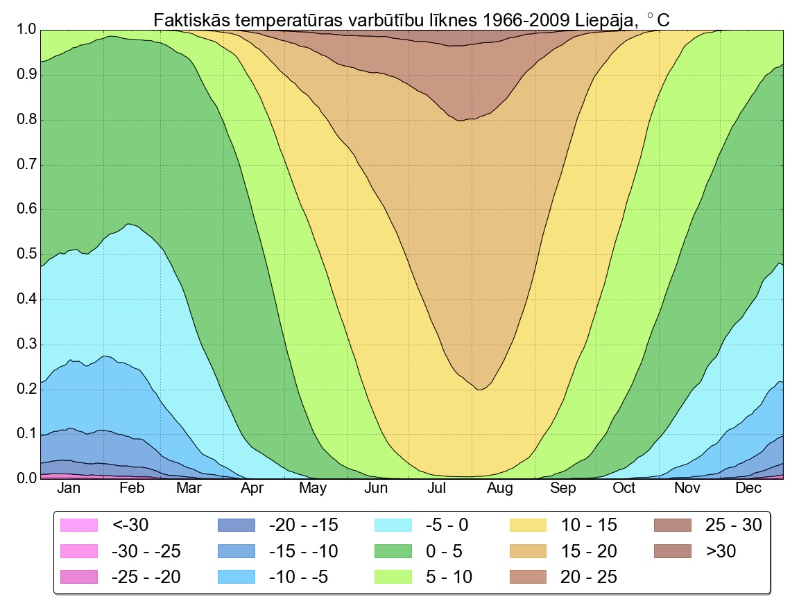 Faktiskās temperatūras pietiekamības līknes un varbūtības blīvums