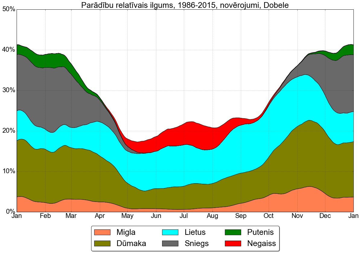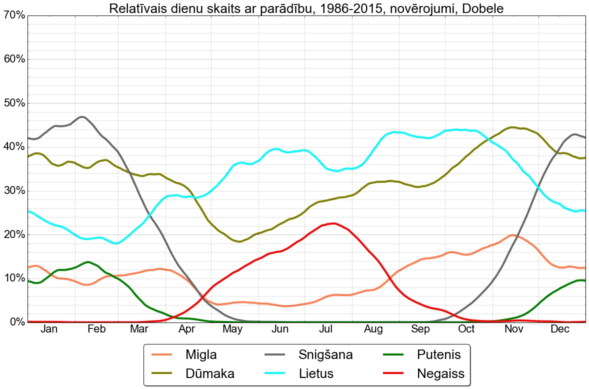 Attēlos ar līknēm attēlots izvēlēto parādību relatīvais dienu skaits un relatīvais ilgums pa kalendārajām dienām.