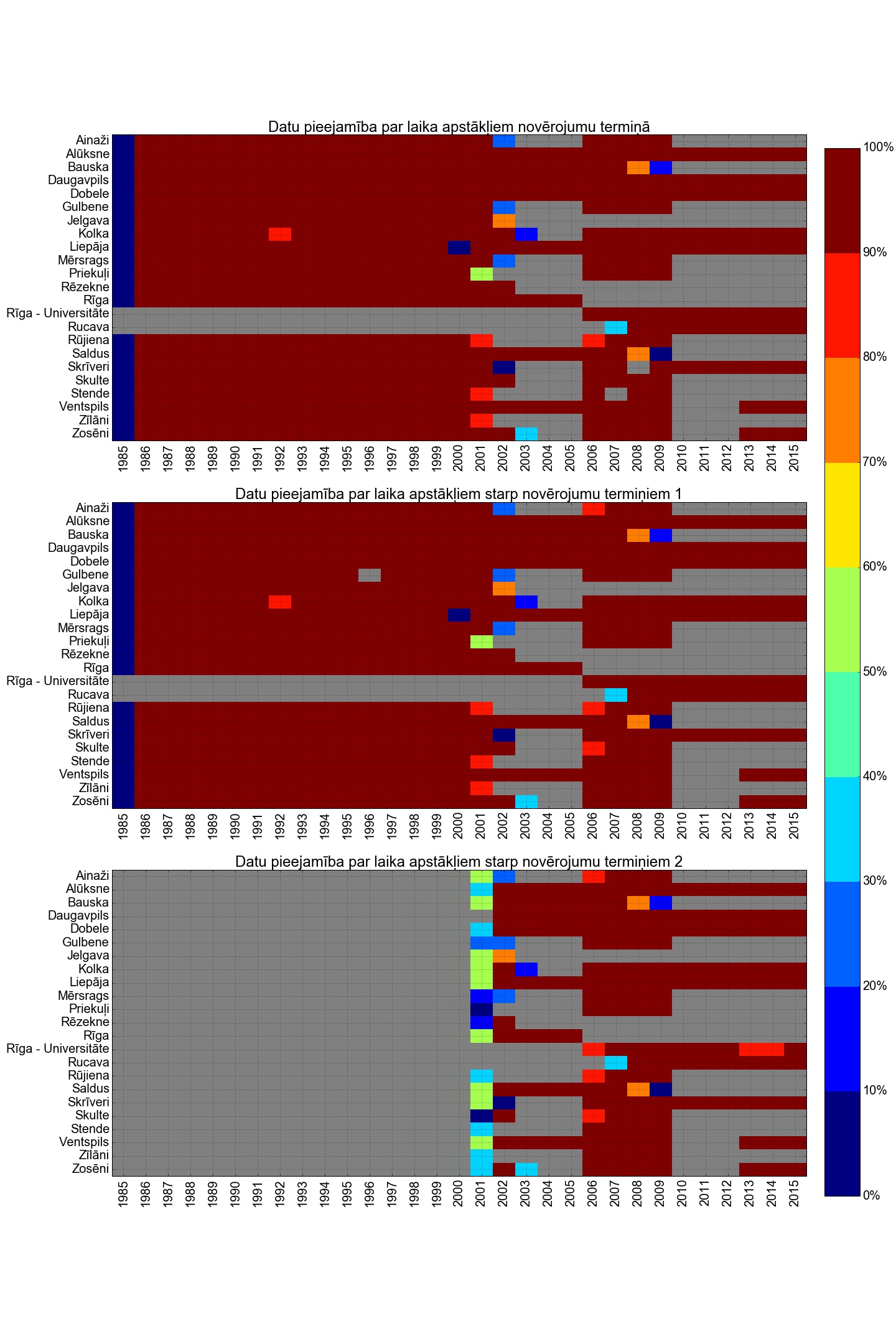 Datu avots ir LVĢMC novērojumu dati. LVĢMC brīvpieejas datos atrodami dati par laika apstākļiem novērojumu termiņā, kā arī divas atsevišķas datu kopas par laika apstākļiem starp novērojumu termiņiem - pāgājušie laika apstākļi. Apkopoto datu pieejamības grafiku pa gadiem skatīt šeit. Datu analīzei izmantoti faktiskās dati par laikaapstākļiem novērojumu termiņā un pagājušajiem laika aptākļiem starp termiņiem 1 periodam 1986-2015. Datu apstrāde veikta 22 novērojumu stacijām. Dati visam periodam pieejami tikai Alūksnē, Daugavpilī, Dobelē un Liepājā. Pārējās stacijās datu pieejamība variē, bet vairumā staciju dati ir pieejami laika posmos 1986-2001 un 2006-2009. Dati kopš 2010.gada ir pieejami Alūksnē, Daugavpilī, Dobelē, Kolkā, Liepājā, Rīgā/LU, Rucavā, Saldū, bet kopš 2013.gada arī Ventspilī un Zosēnos.